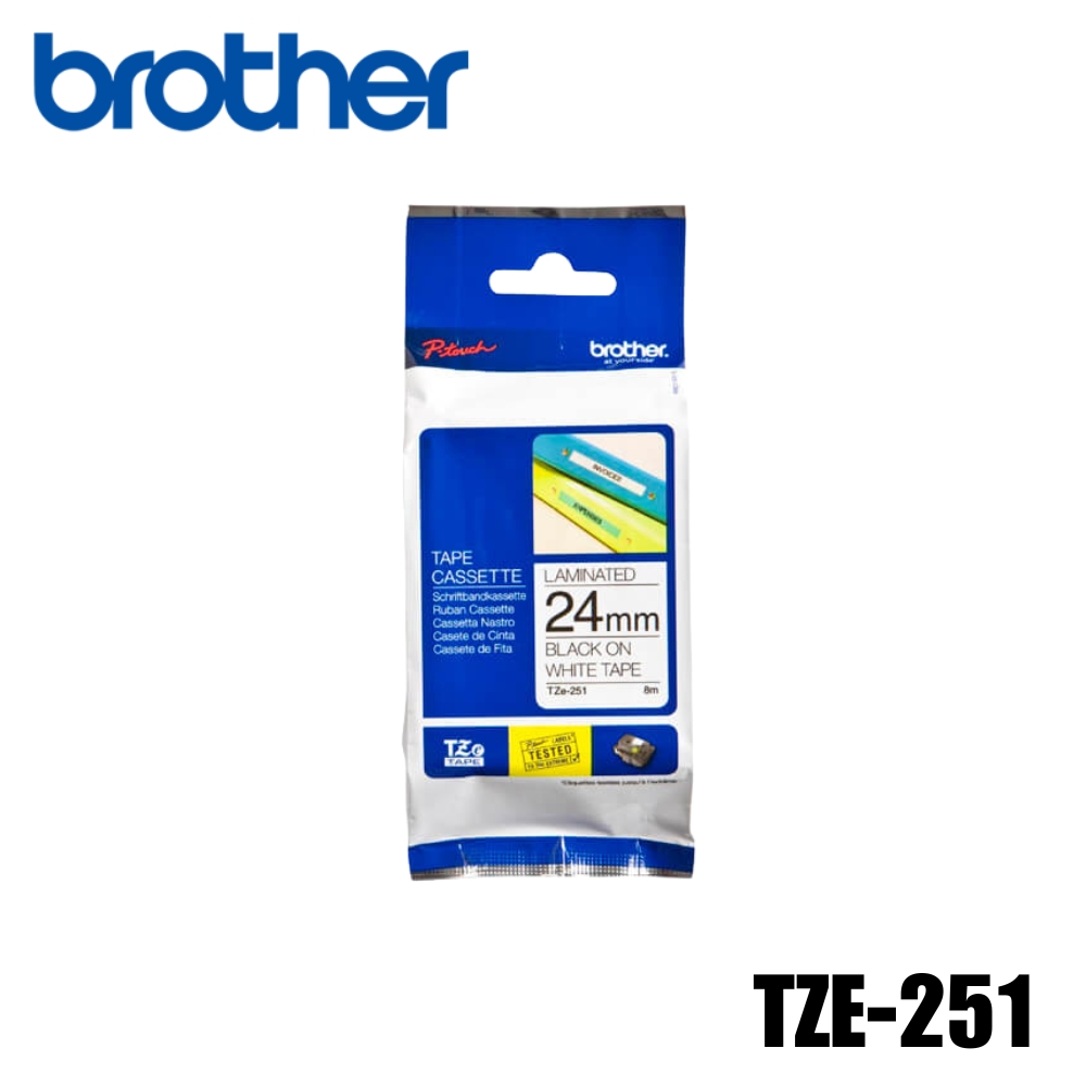 El casete de cinta TZE251 es un consumible original Brother (Negro sobre Blanco, 24mm) compatible con P-touch PT-D600 y PT-P900W, diseñado para etiquetas de alta visibilidad y gran tamaño.